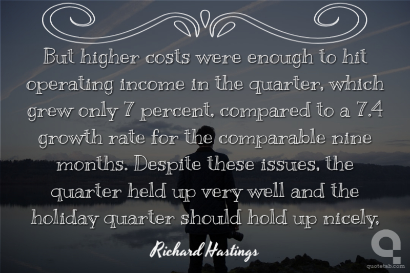 But higher costs were enough to hit operating income in the quarter, which grew only 7 percent, compared to a 7.4 growth rate for the comparable nine months. Despite these issues, the quarter held up very well and the holiday quarter should hold up nicely,
