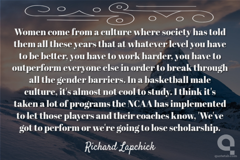 Women come from a culture where society has told them all these years that at whatever level you have to be better, you have to work harder, you have to outperform everyone else in order to break through all the gender barriers. In a basketball male culture, it's almost not cool to study. I think it's taken a lot of programs the NCAA has implemented to let those players and their coaches know, 'We've got to perform or we're going to lose scholarship.