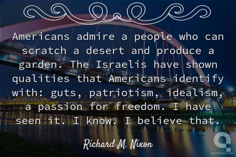 Americans admire a people who can scratch a desert and produce a garden. The Israelis have shown qualities that Americans identify with: guts, patriotism, idealism, a passion for freedom. I have seen it. I know. I believe that.