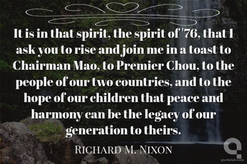 It is in that spirit, the spirit of '76, that I ask you to rise and join me in a toast to Chairman Mao, to Premier Chou, to the people of our two countries, and to the hope of our children that peace and harmony can be the legacy of our generation to theirs.