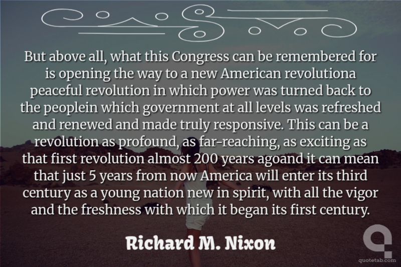 But above all, what this Congress can be remembered for is opening the way to a new American revolutiona peaceful revolution in which power was turned back to the peoplein which government at all levels was refreshed and renewed and made truly responsive. This can be a revolution as profound, as far-reaching, as exciting as that first revolution almost 200 years agoand it can mean that just 5 years from now America will enter its third century as a young nation new in spirit, with all the vigor and the freshness with which it began its first century.