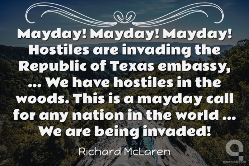 Mayday! Mayday! Mayday! Hostiles are invading the Republic of Texas embassy, ... We have hostiles in the woods. This is a mayday call for any nation in the world ... We are being invaded!