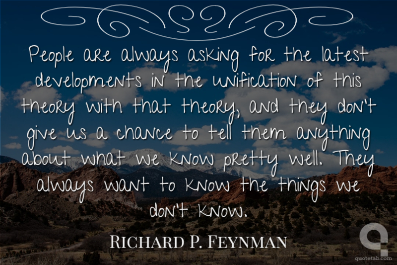 People are always asking for the latest developments in the unification of this theory with that theory, and they don't give us a chance to tell them anything about what we know pretty well. They always want to know the things we don't know.