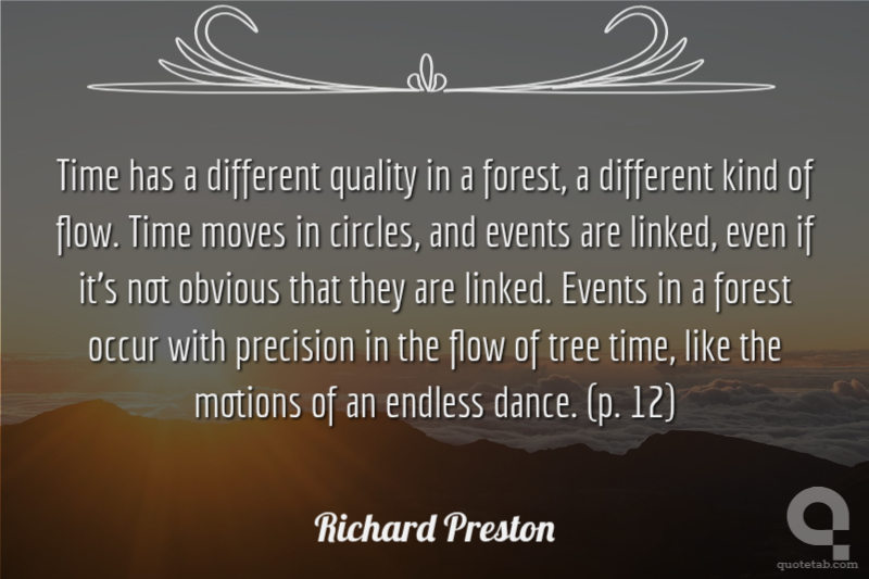 Time has a different quality in a forest, a different kind of flow. Time moves in circles, and events are linked, even if it's not obvious that they are linked. Events in a forest occur with precision in the flow of tree time, like the motions of an endless dance. (p. 12)
