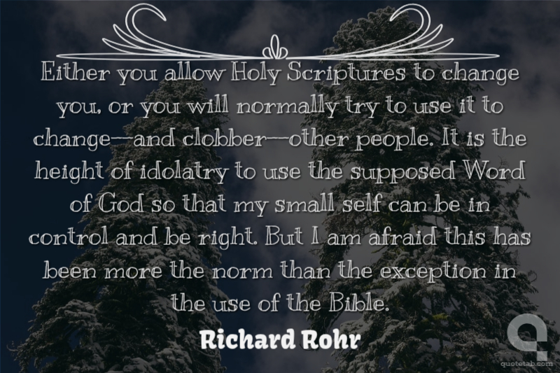 Either you allow Holy Scriptures to change you, or you will normally try to use it to change--and clobber--other people. It is the height of idolatry to use the supposed Word of God so that my small self can be in control and be right. But I am afraid this has been more the norm than the exception in the use of the Bible.