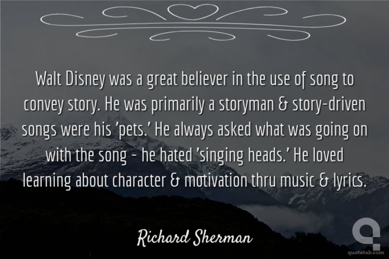 Walt Disney was a great believer in the use of song to convey story. He was primarily a storyman & story-driven songs were his 'pets.' He always asked what was going on with the song - he hated 'singing heads.' He loved learning about character & motivation thru music & lyrics.