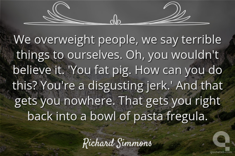 We overweight people, we say terrible things to ourselves. Oh, you wouldn't believe it. 'You fat pig. How can you do this? You're a disgusting jerk.' And that gets you nowhere. That gets you right back into a bowl of pasta fregula.