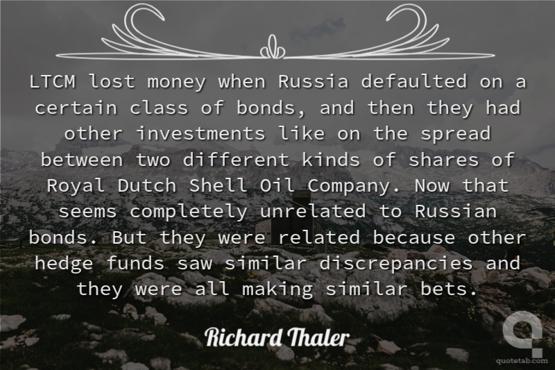 LTCM lost money when Russia defaulted on a certain class of bonds, and then they had other investments like on the spread between two different kinds of shares of Royal Dutch Shell Oil Company. Now that seems completely unrelated to Russian bonds. But they were related because other hedge funds saw similar discrepancies and they were all making similar bets.