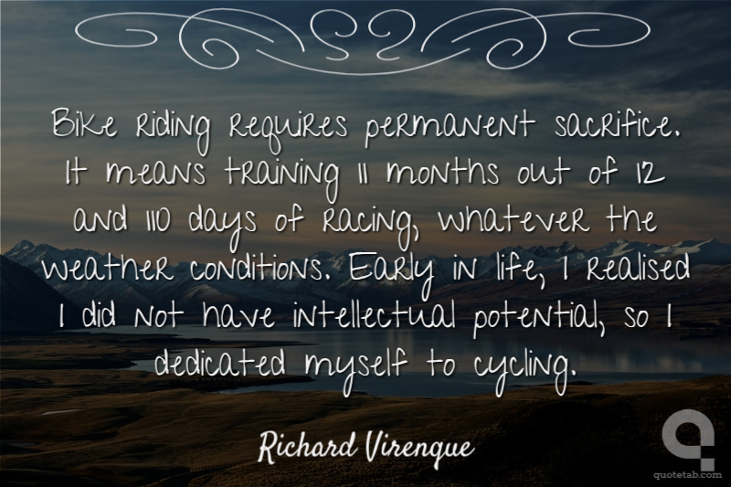 Bike riding requires permanent sacrifice. It means training 11 months out of 12 and 110 days of racing, whatever the weather conditions. Early in life, I realised I did not have intellectual potential, so I dedicated myself to cycling.