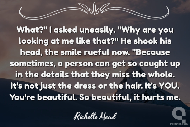 What?" I asked uneasily. "Why are you looking at me like that?" He shook his head, the smile rueful now. "Because sometimes, a person can get so caught up in the details that they miss the whole. It's not just the dress or the hair. It's YOU. You're beautiful. So beautiful, it hurts me.