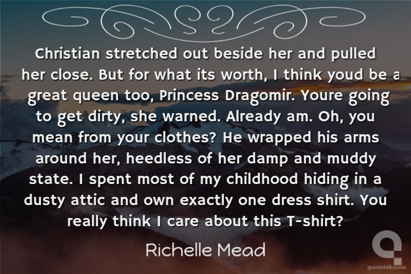 Christian stretched out beside her and pulled her close. ʺBut for what itʹs worth, I think youʹd be a great queen too, Princess Dragomir.ʺ ʺYouʹre going to get dirty,ʺ she warned. ʺAlready am. Oh, you mean from your clothes?ʺ He wrapped his arms around her, heedless of her damp and muddy state. ʺI spent most of my childhood hiding in a dusty attic and own exactly one dress shirt. You really think I care about this T-shirt?ʺ