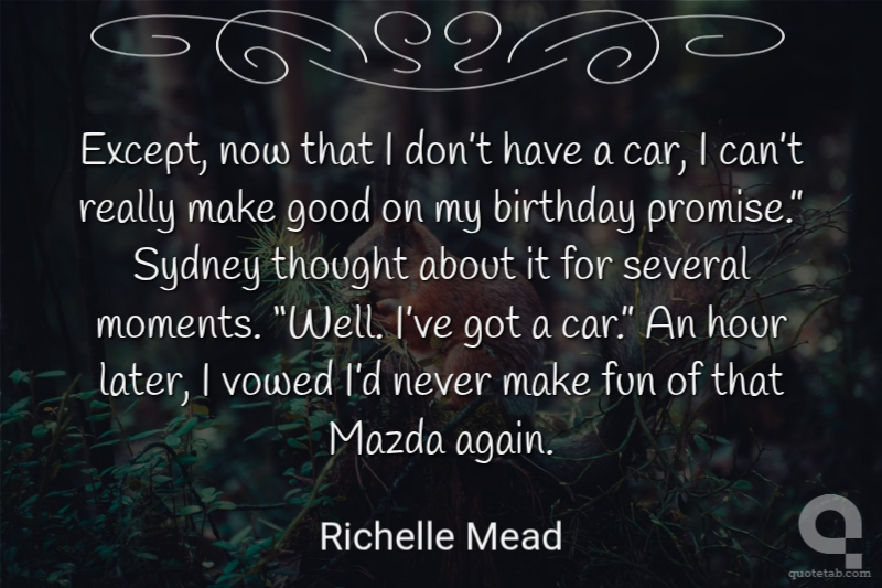 Except, now that I don’t have a car, I can’t really make good on my birthday promise.” Sydney thought about it for several moments. “Well. I’ve got a car.” An hour later, I vowed I’d never make fun of that Mazda again.
