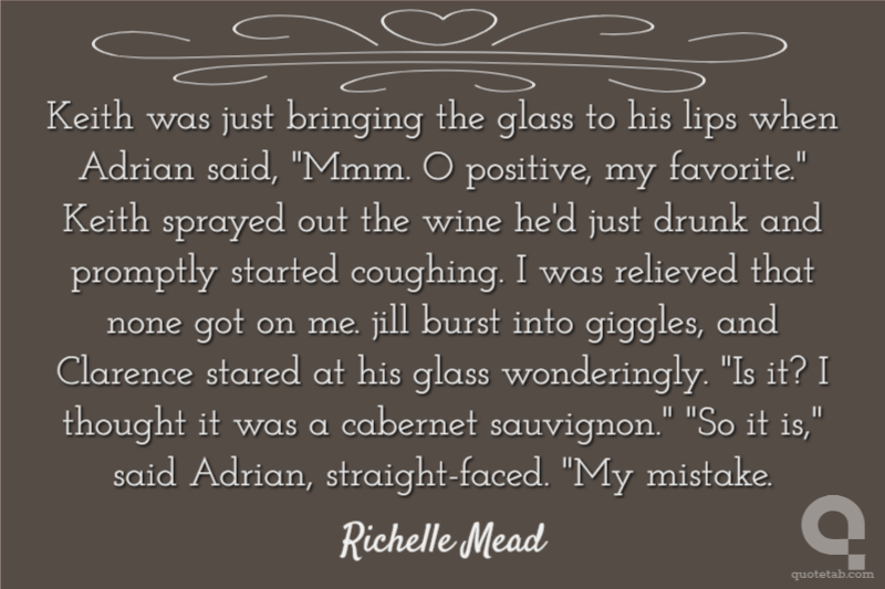 Keith was just bringing the glass to his lips when Adrian said, "Mmm. O positive, my favorite." Keith sprayed out the wine he'd just drunk and promptly started coughing. I was relieved that none got on me. jill burst into giggles, and Clarence stared at his glass wonderingly. "Is it? I thought it was a cabernet sauvignon." "So it is," said Adrian, straight-faced. "My mistake.
