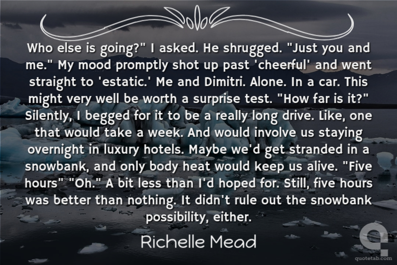 Who else is going?" I asked. He shrugged. "Just you and me." My mood promptly shot up past 'cheerful' and went straight to 'estatic.' Me and Dimitri. Alone. In a car. This might very well be worth a surprise test. "How far is it?" Silently, I begged for it to be a really long drive. Like, one that would take a week. And would involve us staying overnight in luxury hotels. Maybe we'd get stranded in a snowbank, and only body heat would keep us alive. "Five hours" "Oh." A bit less than I'd hoped for. Still, five hours was better than nothing. It didn't rule out the snowbank possibility, either.