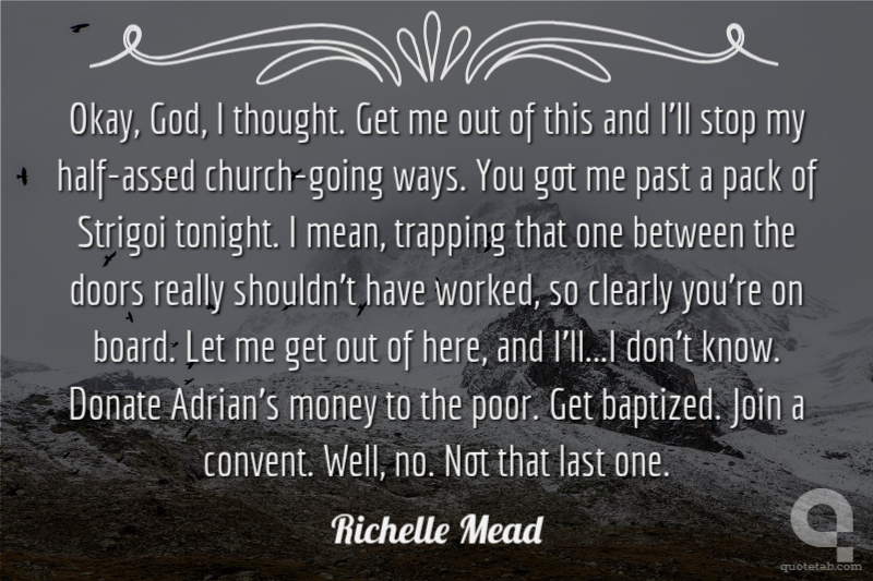 Okay, God, I thought. Get me out of this and I’ll stop my half-assed church-going ways. You got me past a pack of Strigoi tonight. I mean, trapping that one between the doors really shouldn't have worked, so clearly you're on board. Let me get out of here, and I’ll...I don’t know. Donate Adrian’s money to the poor. Get baptized. Join a convent. Well, no. Not that last one.