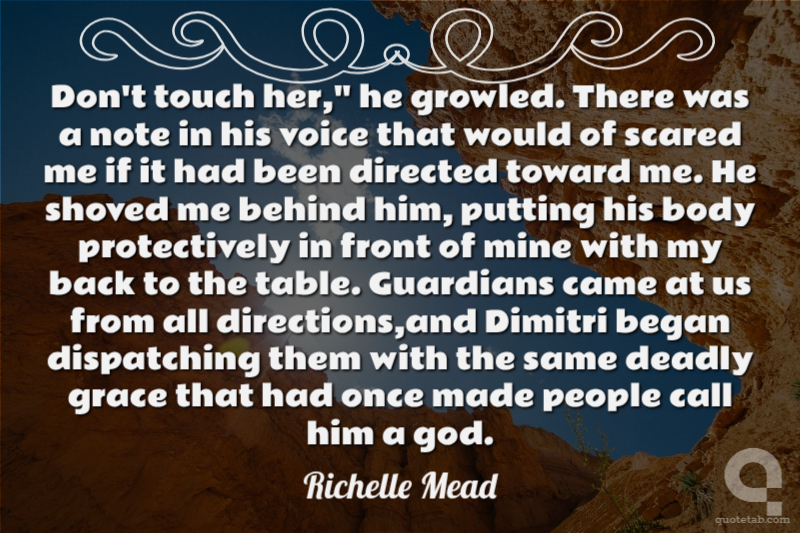 Don't touch her," he growled. There was a note in his voice that would of scared me if it had been directed toward me. He shoved me behind him, putting his body protectively in front of mine with my back to the table. Guardians came at us from all directions,and Dimitri began dispatching them with the same deadly grace that had once made people call him a god.