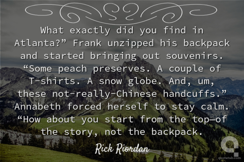 What exactly did you find in Atlanta?” Frank unzipped his backpack and started bringing out souvenirs. “Some peach preserves. A couple of T-shirts. A snow globe. And, um, these not-really-Chinese handcuffs.” Annabeth forced herself to stay calm. “How about you start from the top—of the story, not the backpack.