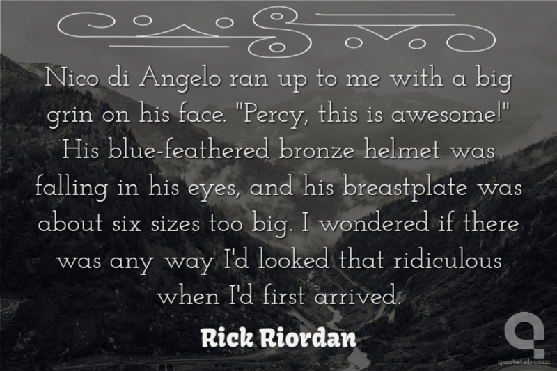 Nico di Angelo ran up to me with a big grin on his face. "Percy, this is awesome!" His blue-feathered bronze helmet was falling in his eyes, and his breastplate was about six sizes too big. I wondered if there was any way I'd looked that ridiculous when I'd first arrived.