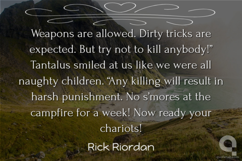 Weapons are allowed. Dirty tricks are expected. But try not to kill anybody!” Tantalus smiled at us like we were all naughty children. “Any killing will result in harsh punishment. No s’mores at the campfire for a week! Now ready your chariots!