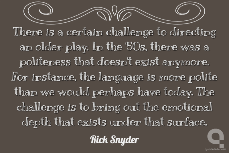 There is a certain challenge to directing an older play. In the '50s, there was a politeness that doesn't exist anymore. For instance, the language is more polite than we would perhaps have today. The challenge is to bring out the emotional depth that exists under that surface.