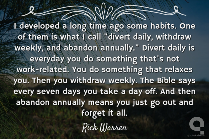 I developed a long time ago some habits. One of them is what I call "divert daily, withdraw weekly, and abandon annually." Divert daily is everyday you do something that's not work-related. You do something that relaxes you. Then you withdraw weekly. The Bible says every seven days you take a day off. And then abandon annually means you just go out and forget it all.