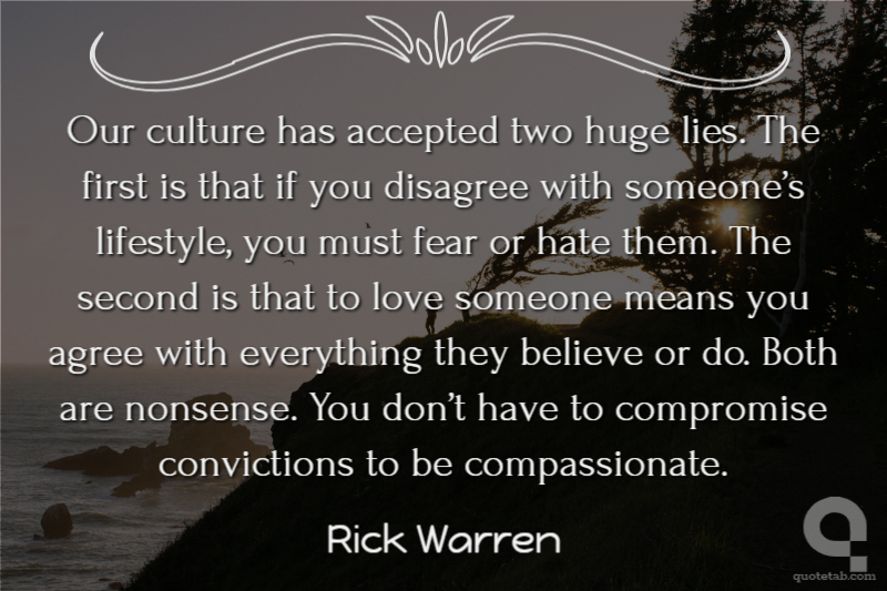 Our culture has accepted two huge lies. The first is that if you disagree with someone’s lifestyle, you must fear or hate them. The second is that to love someone means you agree with everything they believe or do. Both are nonsense. You don’t have to compromise convictions to be compassionate.