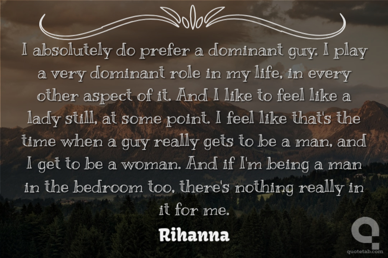 I absolutely do prefer a dominant guy. I play a very dominant role in my life, in every other aspect of it. And I like to feel like a lady still, at some point. I feel like that's the time when a guy really gets to be a man, and I get to be a woman. And if I'm being a man in the bedroom too, there's nothing really in it for me.