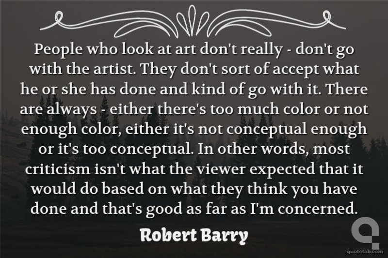 People who look at art don't really - don't go with the artist. They don't sort of accept what he or she has done and kind of go with it. There are always - either there's too much color or not enough color, either it's not conceptual enough or it's too conceptual. In other words, most criticism isn't what the viewer expected that it would do based on what they think you have done and that's good as far as I'm concerned.