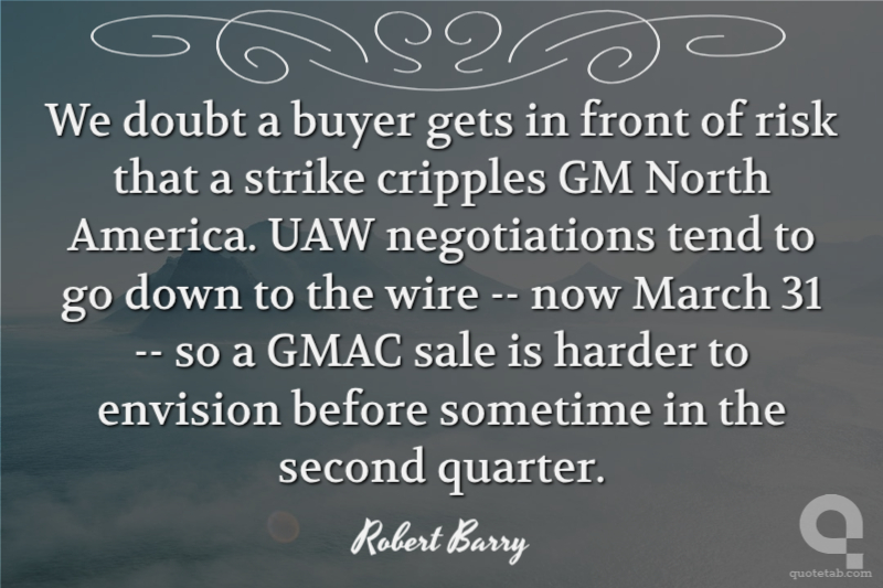 We doubt a buyer gets in front of risk that a strike cripples GM North America. UAW negotiations tend to go down to the wire -- now March 31 -- so a GMAC sale is harder to envision before sometime in the second quarter.