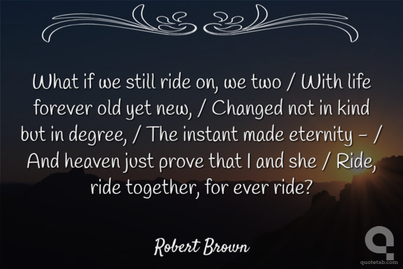 What if we still ride on, we two / With life forever old yet new, / Changed not in kind but in degree, / The instant made eternity - / And heaven just prove that I and she / Ride, ride together, for ever ride?