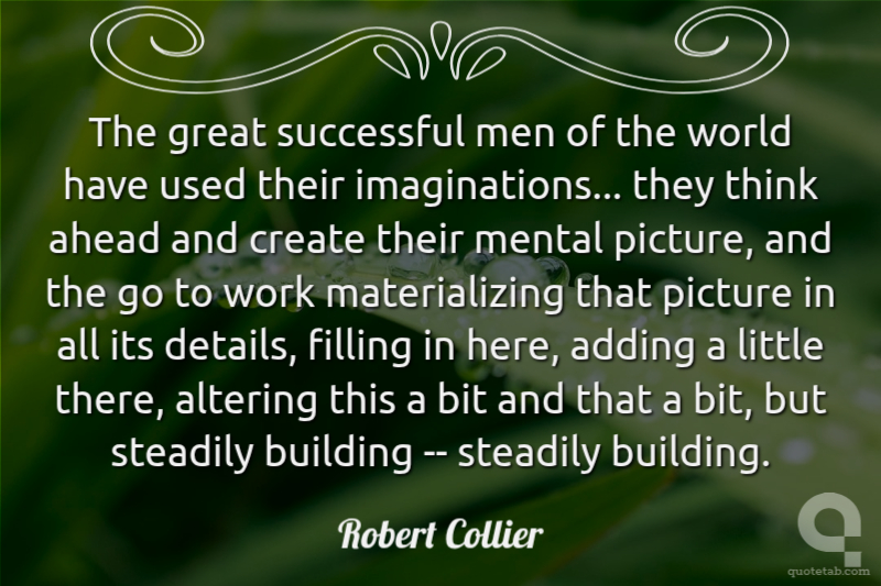 The great successful men of the world have used their imaginations... they think ahead and create their mental picture, and the go to work materializing that picture in all its details, filling in here, adding a little there, altering this a bit and that a bit, but steadily building -- steadily building.