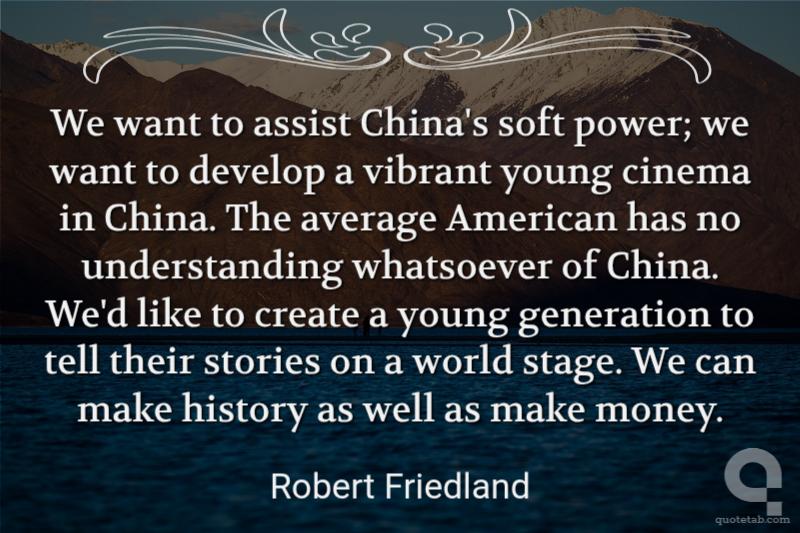 We want to assist China's soft power; we want to develop a vibrant young cinema in China. The average American has no understanding whatsoever of China. We'd like to create a young generation to tell their stories on a world stage. We can make history as well as make money.