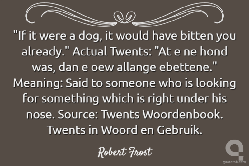 "If it were a dog, it would have bitten you already." Actual Twents: "At e ne hond was, dan e oew allange ebettene." Meaning: Said to someone who is looking for something which is right under his nose. Source: Twents Woordenbook. Twents in Woord en Gebruik.