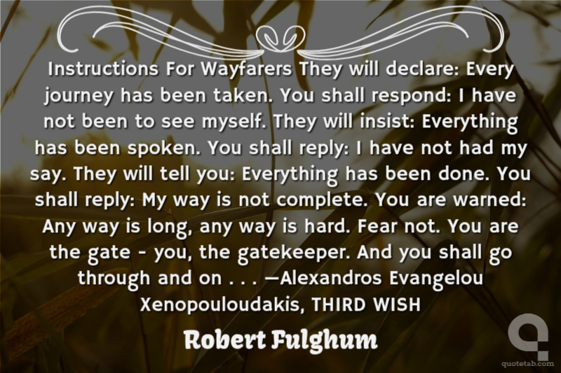 Instructions For Wayfarers They will declare: Every journey has been taken. You shall respond: I have not been to see myself. They will insist: Everything has been spoken. You shall reply: I have not had my say. They will tell you: Everything has been done. You shall reply: My way is not complete. You are warned: Any way is long, any way is hard. Fear not. You are the gate - you, the gatekeeper. And you shall go through and on . . . —Alexandros Evangelou Xenopouloudakis, THIRD WISH