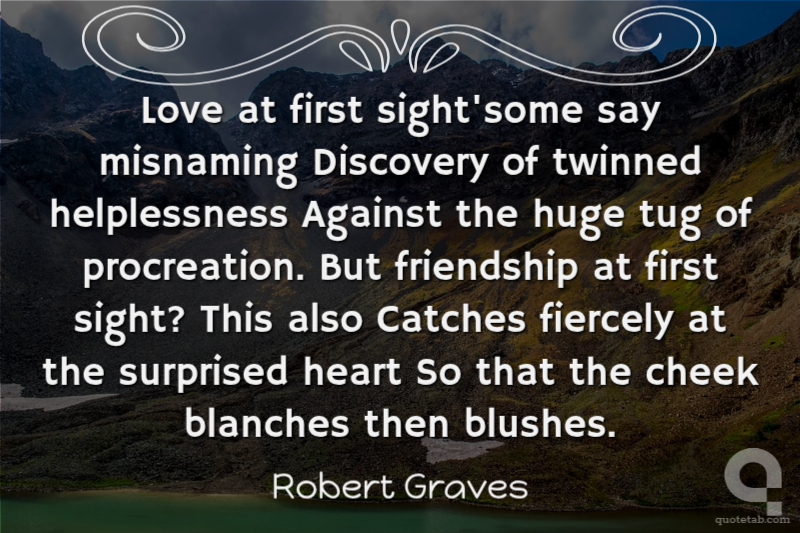 Love at first sight'some say misnaming Discovery of twinned helplessness Against the huge tug of procreation. But friendship at first sight? This also Catches fiercely at the surprised heart So that the cheek blanches then blushes.