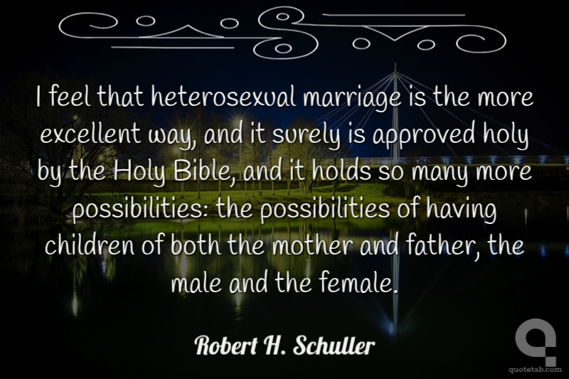 I feel that heterosexual marriage is the more excellent way, and it surely is approved holy by the Holy Bible, and it holds so many more possibilities: the possibilities of having children of both the mother and father, the male and the female.