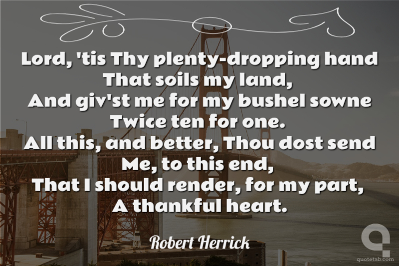 Lord, 'tis Thy plenty-dropping hand That soils my land, And giv'st me for my bushel sowne Twice ten for one. All this, and better, Thou dost send Me, to this end, That I should render, for my part, A thankful heart.