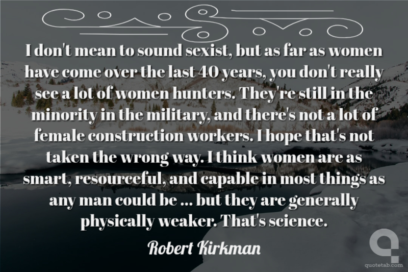 I don't mean to sound sexist, but as far as women have come over the last 40 years, you don't really see a lot of women hunters. They're still in the minority in the military, and there's not a lot of female construction workers. I hope that's not taken the wrong way. I think women are as smart, resourceful, and capable in most things as any man could be … but they are generally physically weaker. That's science.