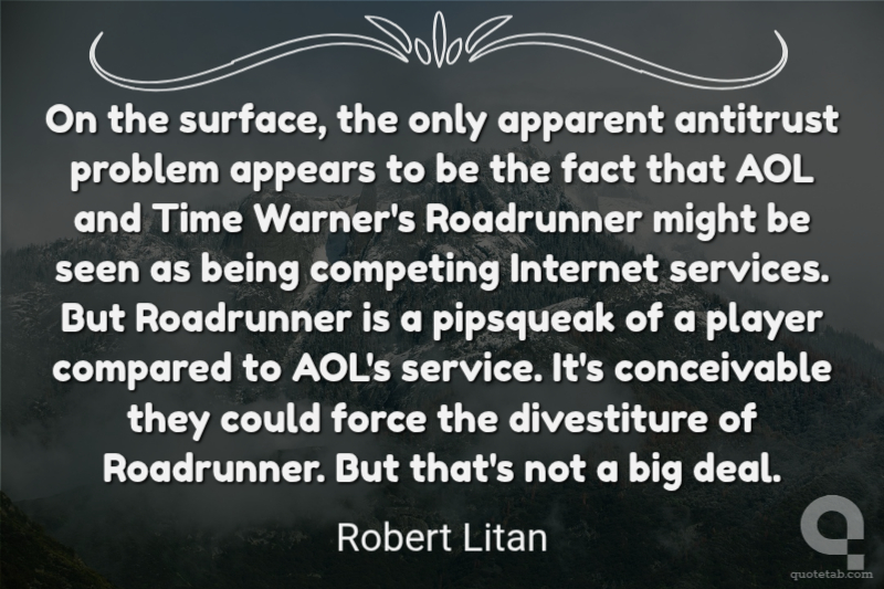 On the surface, the only apparent antitrust problem appears to be the fact that AOL and Time Warner's Roadrunner might be seen as being competing Internet services. But Roadrunner is a pipsqueak of a player compared to AOL's service. It's conceivable they could force the divestiture of Roadrunner. But that's not a big deal.
