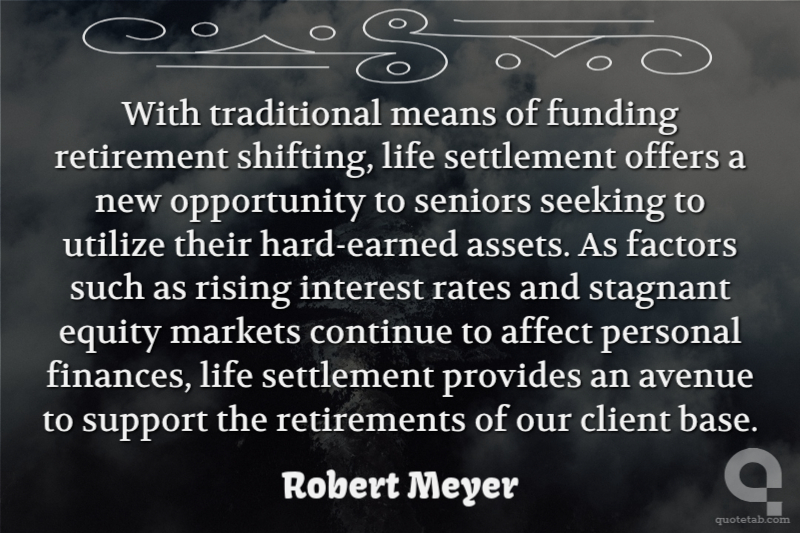 With traditional means of funding retirement shifting, life settlement offers a new opportunity to seniors seeking to utilize their hard-earned assets. As factors such as rising interest rates and stagnant equity markets continue to affect personal finances, life settlement provides an avenue to support the retirements of our client base.