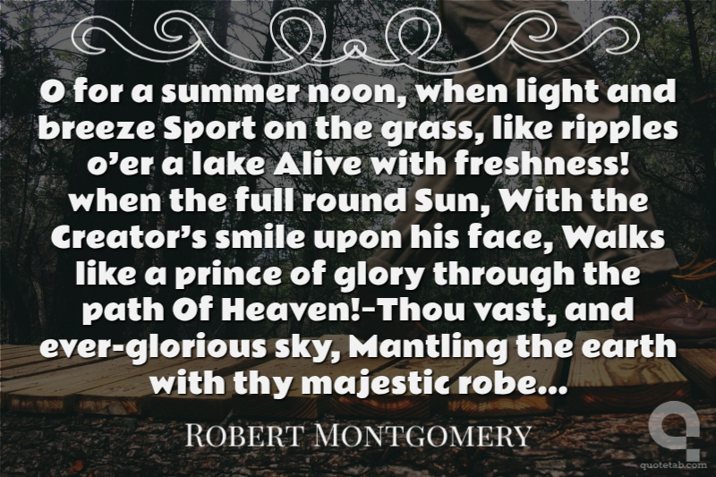 O for a summer noon, when light and breeze Sport on the grass, like ripples o’er a lake Alive with freshness! when the full round Sun, With the Creator’s smile upon his face, Walks like a prince of glory through the path Of Heaven!—Thou vast, and ever-glorious sky, Mantling the earth with thy majestic robe...