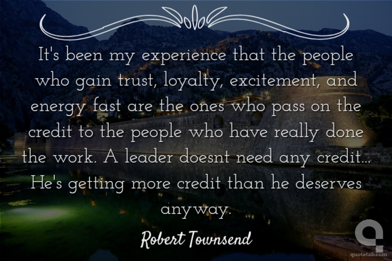 It's been my experience that the people who gain trust, loyalty, excitement, and energy fast are the ones who pass on the credit to the people who have really done the work. A leader doesnt need any credit... He's getting more credit than he deserves anyway.