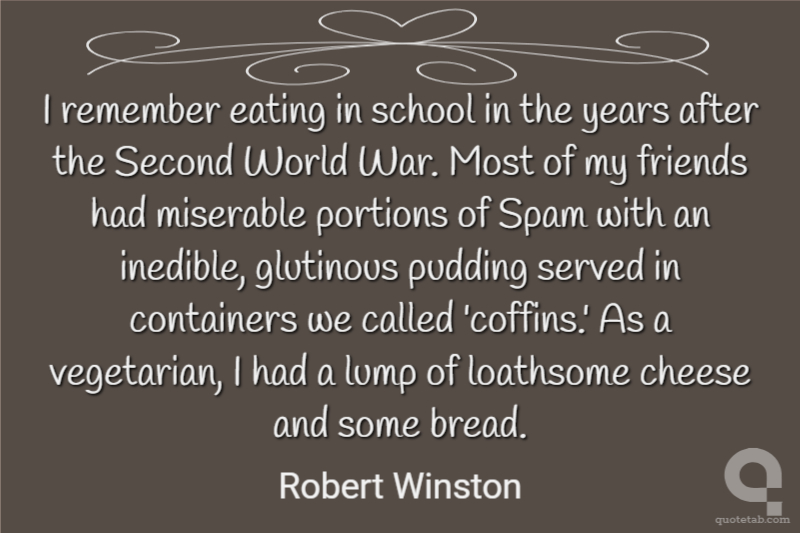 I remember eating in school in the years after the Second World War. Most of my friends had miserable portions of Spam with an inedible, glutinous pudding served in containers we called 'coffins.' As a vegetarian, I had a lump of loathsome cheese and some bread.