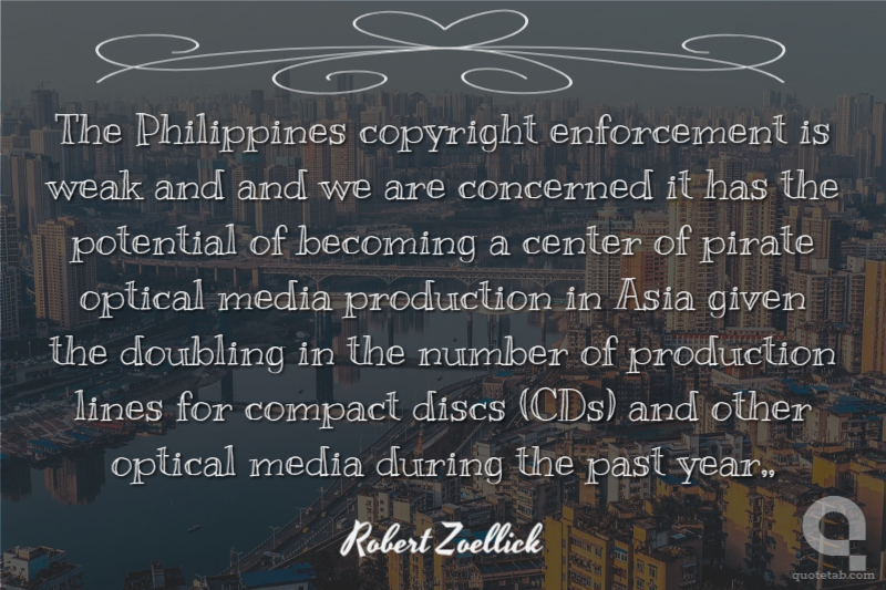 The Philippines copyright enforcement is weak and and we are concerned it has the potential of becoming a center of pirate optical media production in Asia given the doubling in the number of production lines for compact discs (CDs) and other optical media during the past year,,