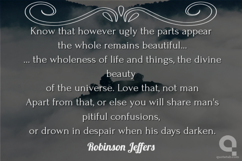 Know that however ugly the parts appear the whole remains beautiful... ... the wholeness of life and things, the divine beauty of the universe. Love that, not man Apart from that, or else you will share man's pitiful confusions, or drown in despair when his days darken.