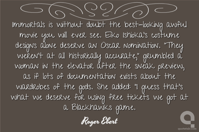 Immortals is without doubt the best-looking awful movie you will ever see. Eiko Ishioka's costume designs alone deserve an Oscar nomination. "They weren't at all historically accurate," grumbled a woman in the elevator after the sneak preview, as if lots of documentation exists about the wardrobes of the gods. She added: "I guess that's what we deserve for using free tickets we got at a Blackhawks game.