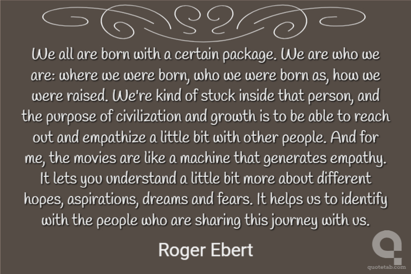We all are born with a certain package. We are who we are: where we were born, who we were born as, how we were raised. We're kind of stuck inside that person, and the purpose of civilization and growth is to be able to reach out and empathize a little bit with other people. And for me, the movies are like a machine that generates empathy. It lets you understand a little bit more about different hopes, aspirations, dreams and fears. It helps us to identify with the people who are sharing this journey with us.