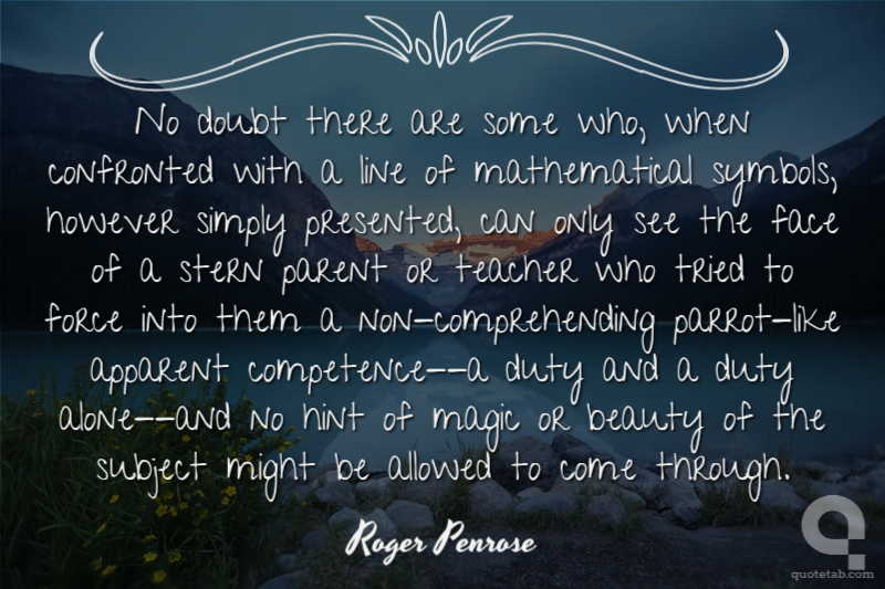 No doubt there are some who, when confronted with a line of mathematical symbols, however simply presented, can only see the face of a stern parent or teacher who tried to force into them a non-comprehending parrot-like apparent competence--a duty and a duty alone--and no hint of magic or beauty of the subject might be allowed to come through.