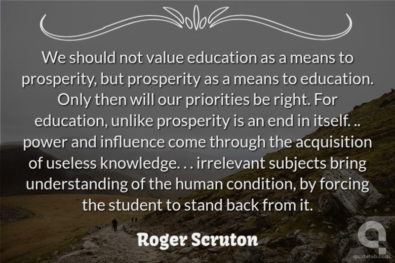 We should not value education as a means to prosperity, but prosperity as a means to education. Only then will our priorities be right. For education, unlike prosperity is an end in itself. .. power and influence come through the acquisition of useless knowledge. . . irrelevant subjects bring understanding of the human condition, by forcing the student to stand back from it.