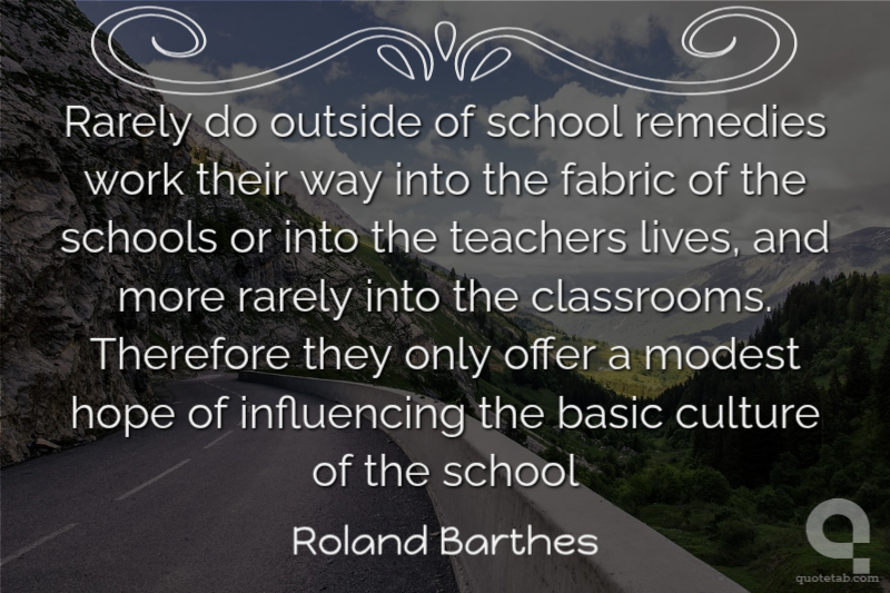 Rarely do outside of school remedies work their way into the fabric of the schools or into the teachers lives, and more rarely into the classrooms. Therefore they only offer a modest hope of influencing the basic culture of the school